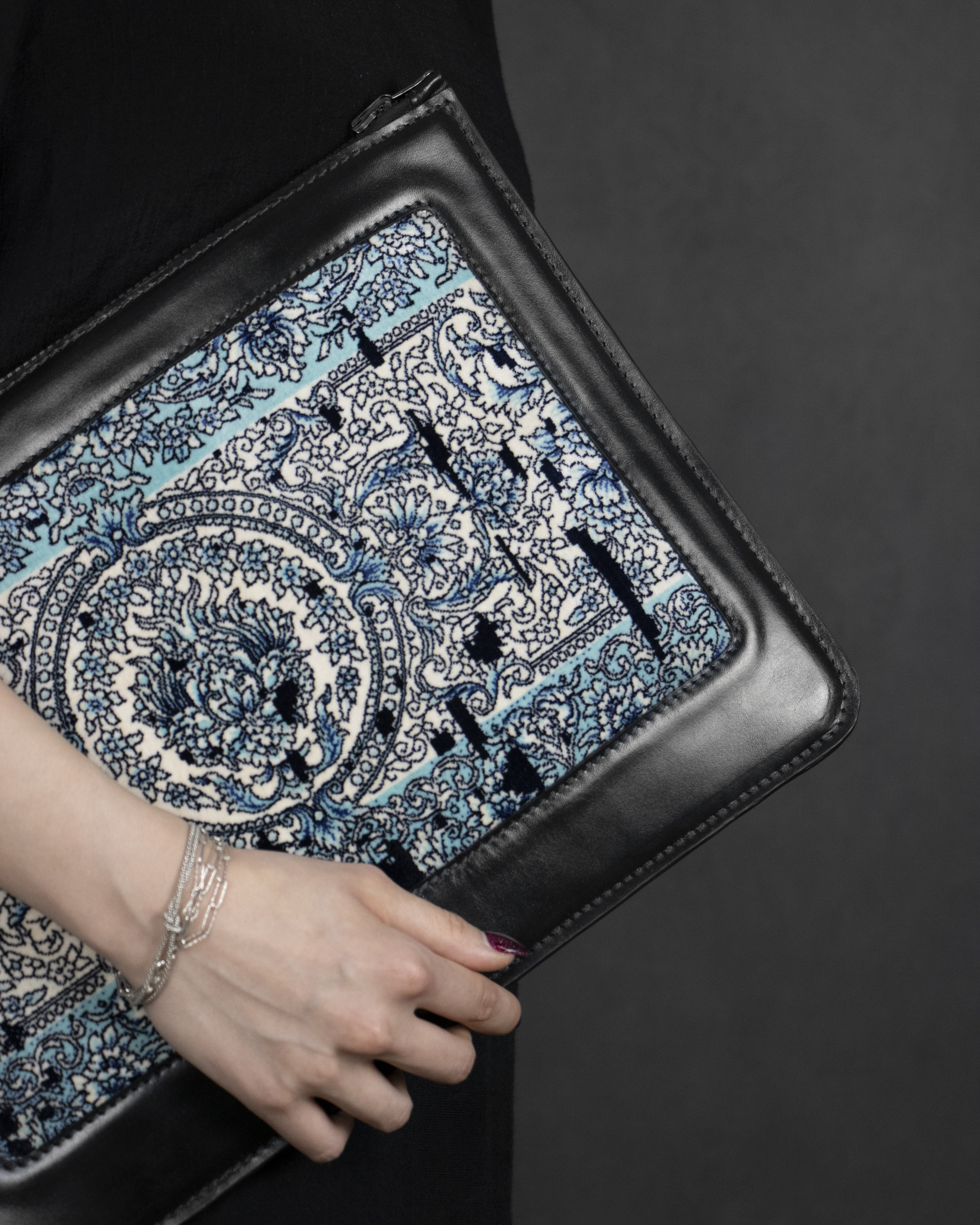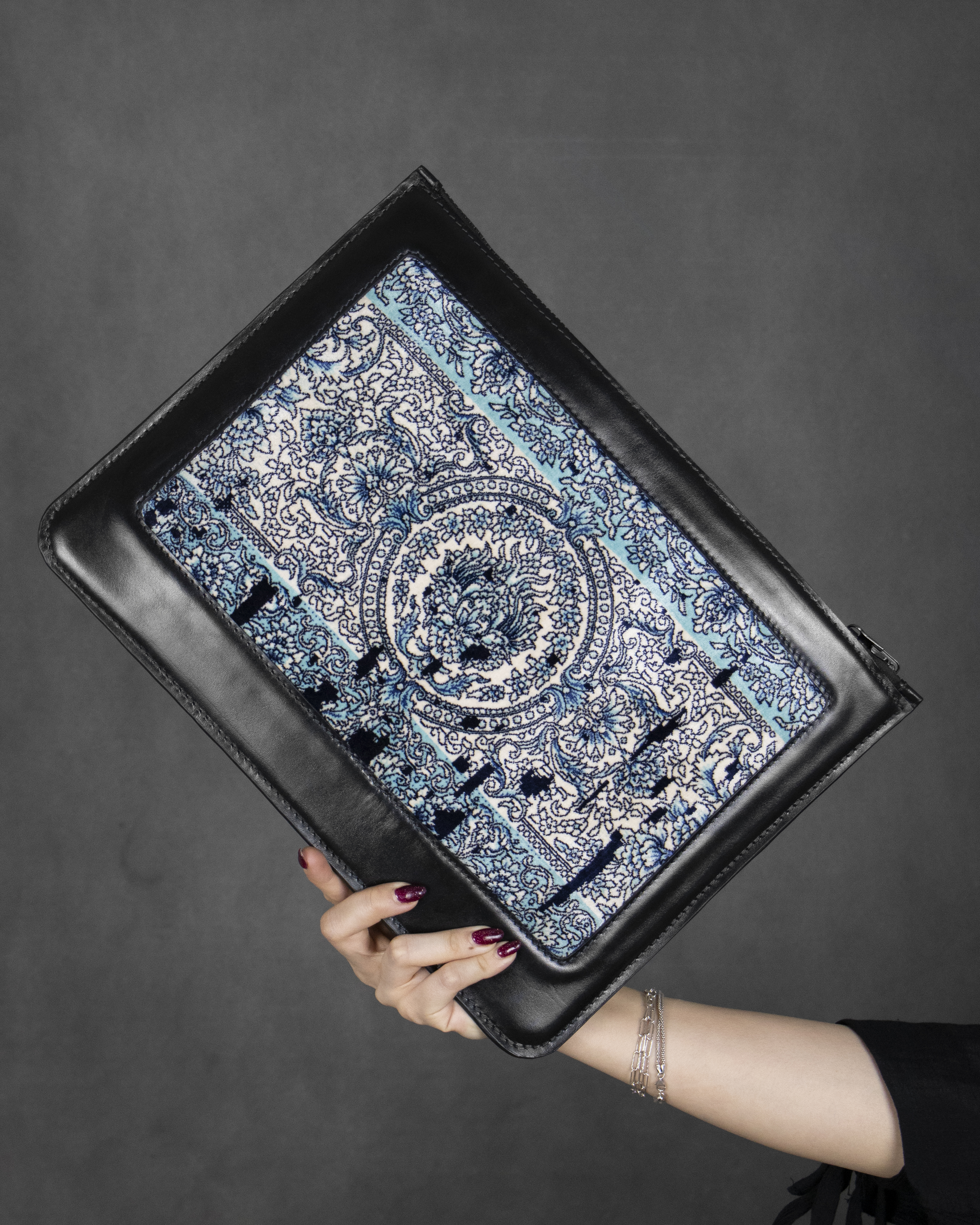 کلاچ چرمی تیران استایل در همکاری با فرش الماس کویر، روایتی از پیوند گذشته و امروز است؛ جایی که بافتهای اصیل ایرانی در دل چرم مدرن جان میگیرند و رنگهای فیروزهای و سرمهای، همچون شعری جاودانه، قصهای از ظرافت، اصالت و استایلی متفاوت را در دستان شما روایت میکنند.